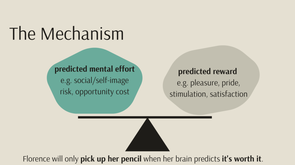 And there’s something else in the prediction too. Florence’s sense of herself is partly built around being someone who draws — or who could. Which means sitting down with the pencils isn’t just a task. It’s a test. The brain prices that in as well.